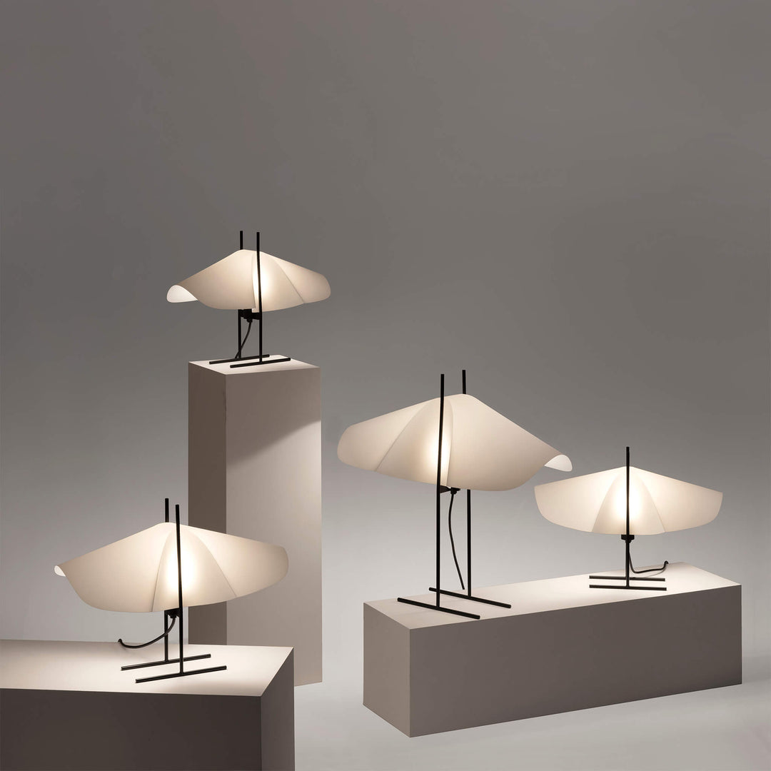 Cho means butterfly in Japanese which is how the shape speaks to the designers. The lightness of the shade meeting the solidity of the steel base, white meeting black.